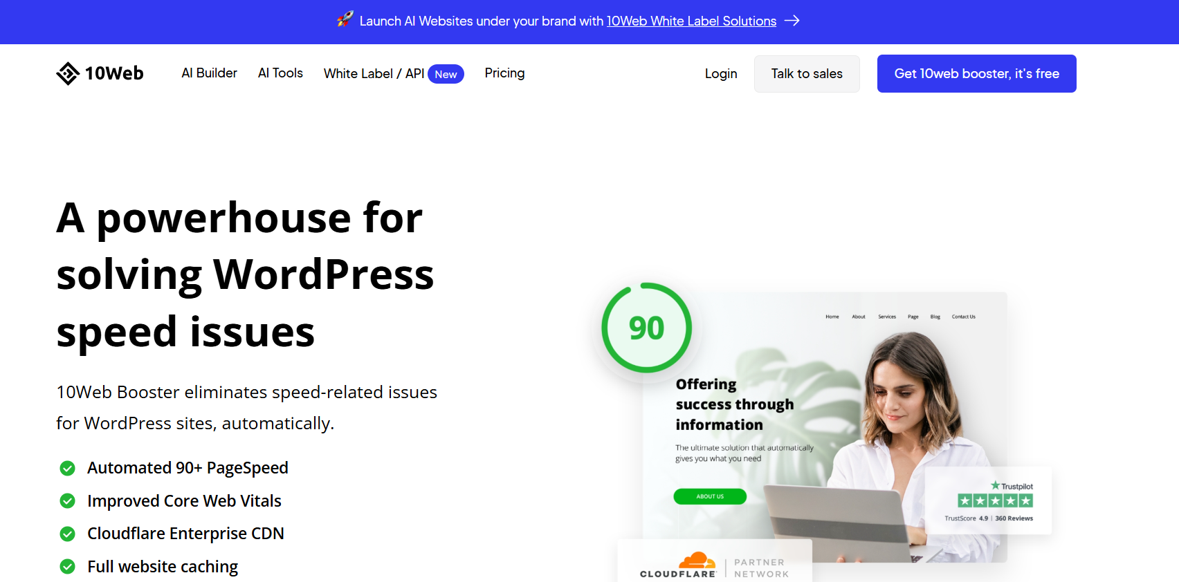 10Web Booster AI analyzes performance bottlenecks and automatically applies fixes. Developed with support from artificial Intelligent companies, it delivers measurable speed improvements without complex configurations.